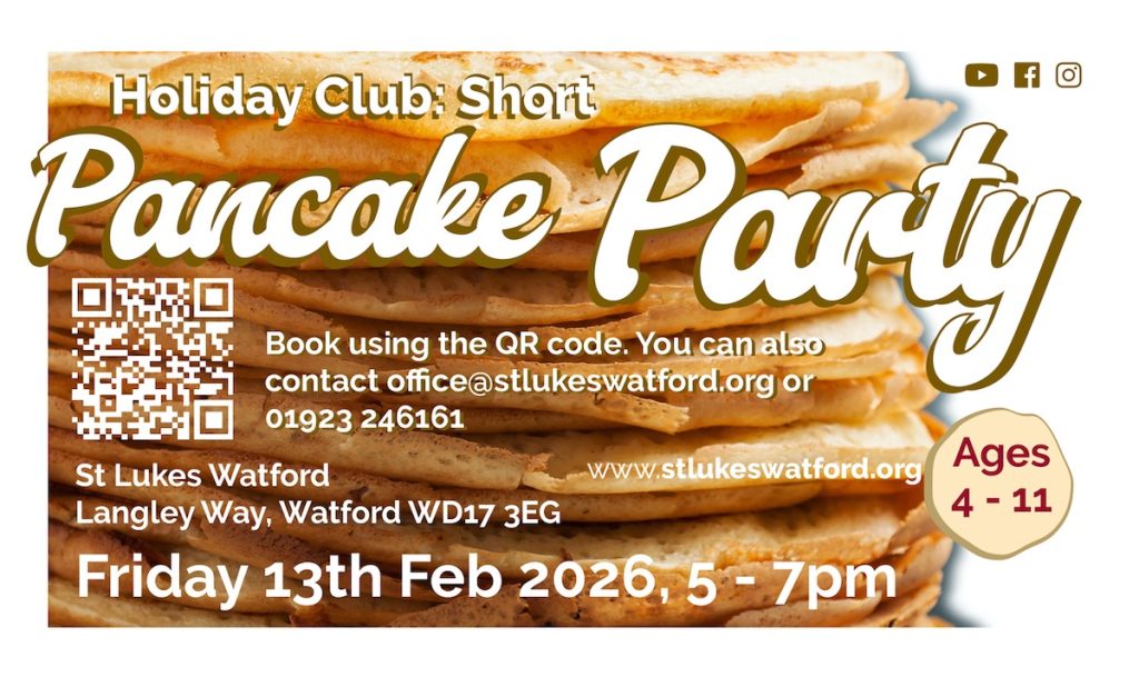 Our next Holiday Club Short is on Friday 13th February 2026, from 5 – 7pm, you can book your child on our St Lukes Watford fun Pancake Party, Holiday Club: Short.