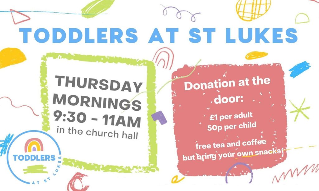 Toddlers at St Lukes welcomes children from 0 to school age and their parent or carer (lots of grandparents come too!) every Thursday morning between 9:30 – 11am in the church hall.